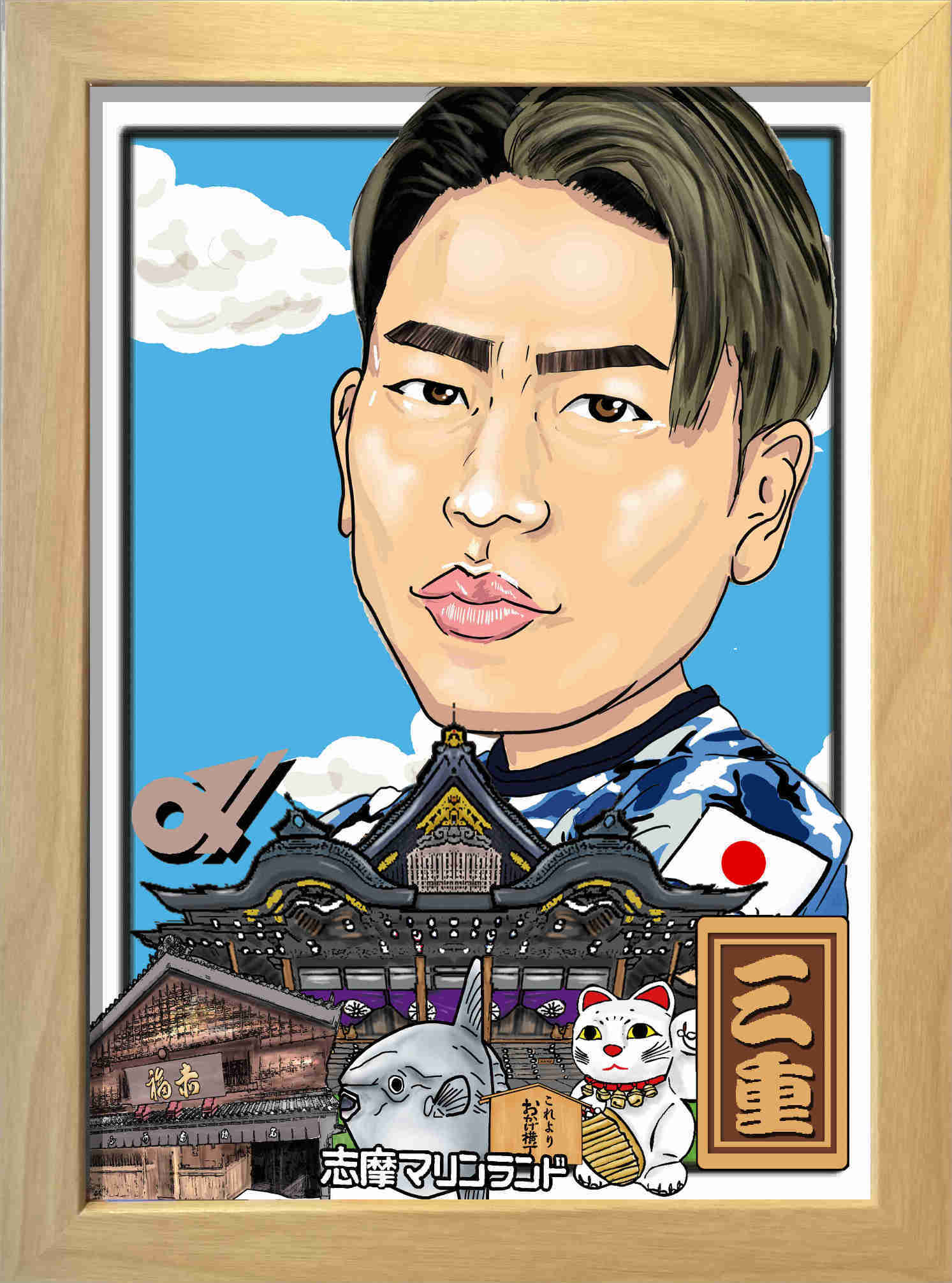 ご当地似顔絵 三重県 です。 伊勢神宮、赤福もち、おかげ横丁の招き猫、志摩マリンランドのマンボー(閉館) と一緒に似顔絵をお描きします。 ご当地愛を感じる一枚に仕上げております。
