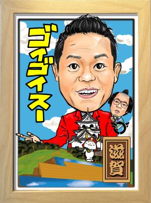 ご当地似顔絵 滋賀県 です。 彦根城、ひこにゃん、琵琶湖テラス と一緒に似顔絵をお描きします。 ご当地愛を感じる一枚に仕上げております。