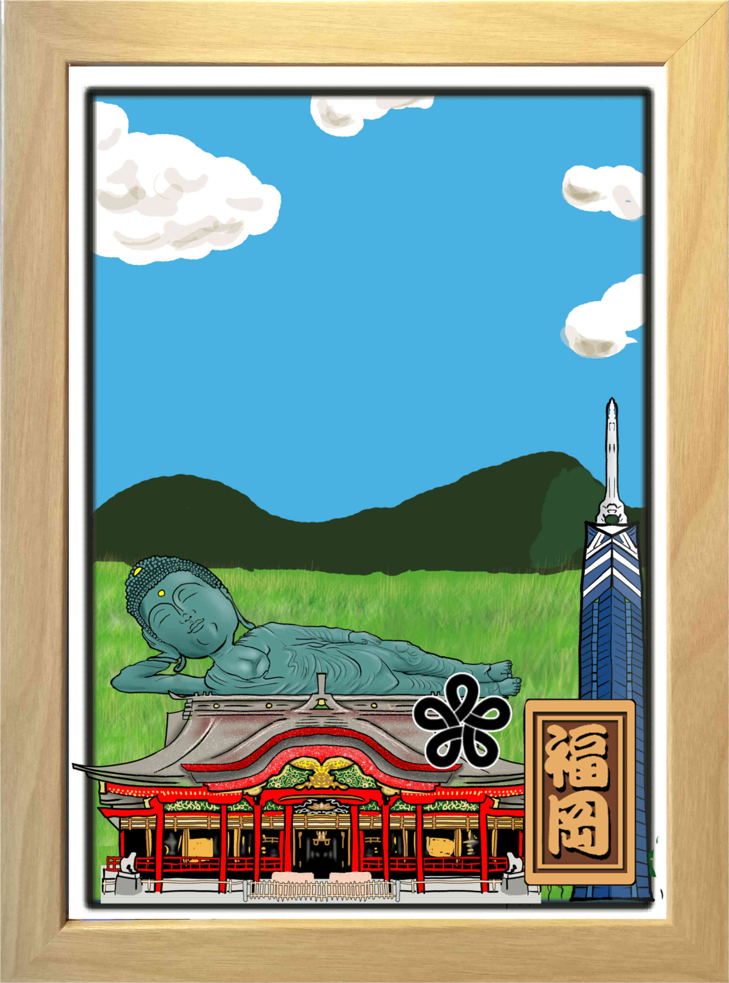 ご当地似顔絵 福岡県 です。 太宰府天満宮、南蔵院の釈迦涅槃像、福岡タワー と一緒に似顔絵をお描きします。 ご当地愛を感じる一枚に仕上げております。