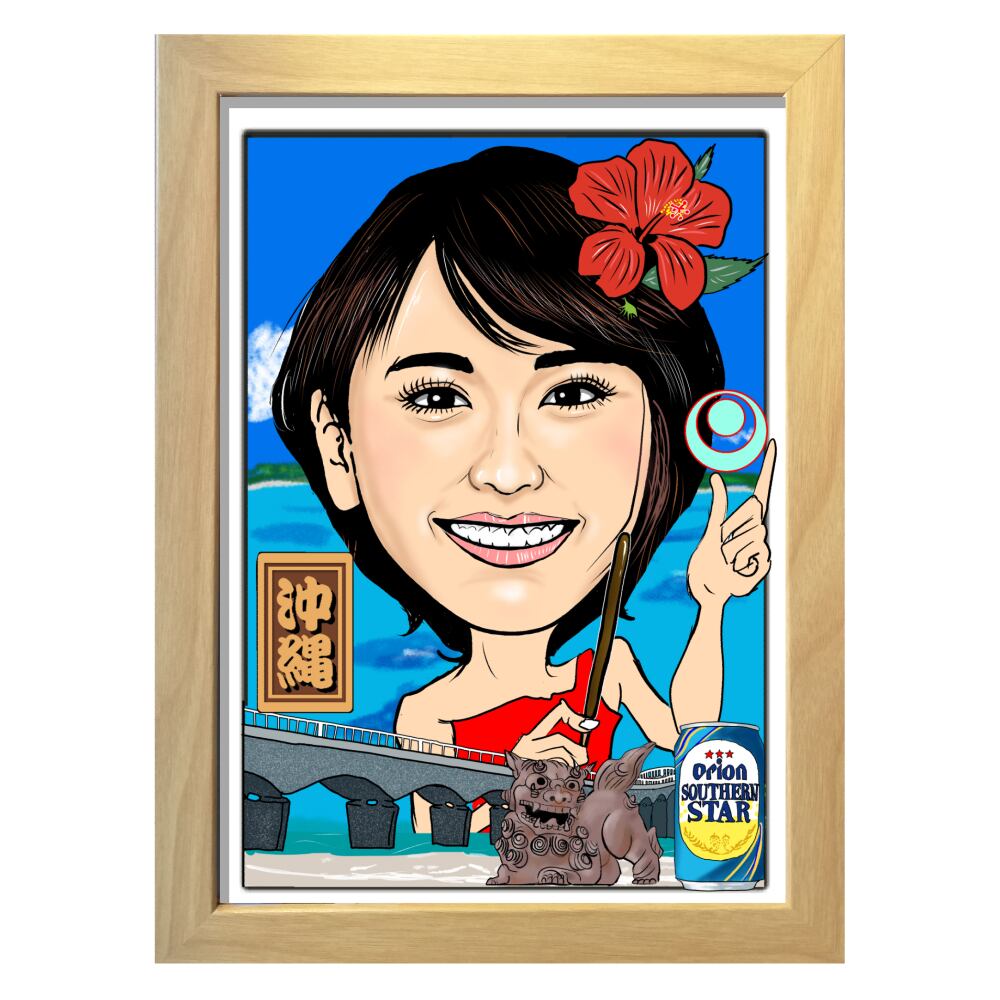 ご当地似顔絵 沖縄県 です。 古宇利島にかかる橋、シーサー、オリオンの缶発泡酒 と一緒に似顔絵をお描きします。 ご当地愛を感じる一枚に仕上げております。